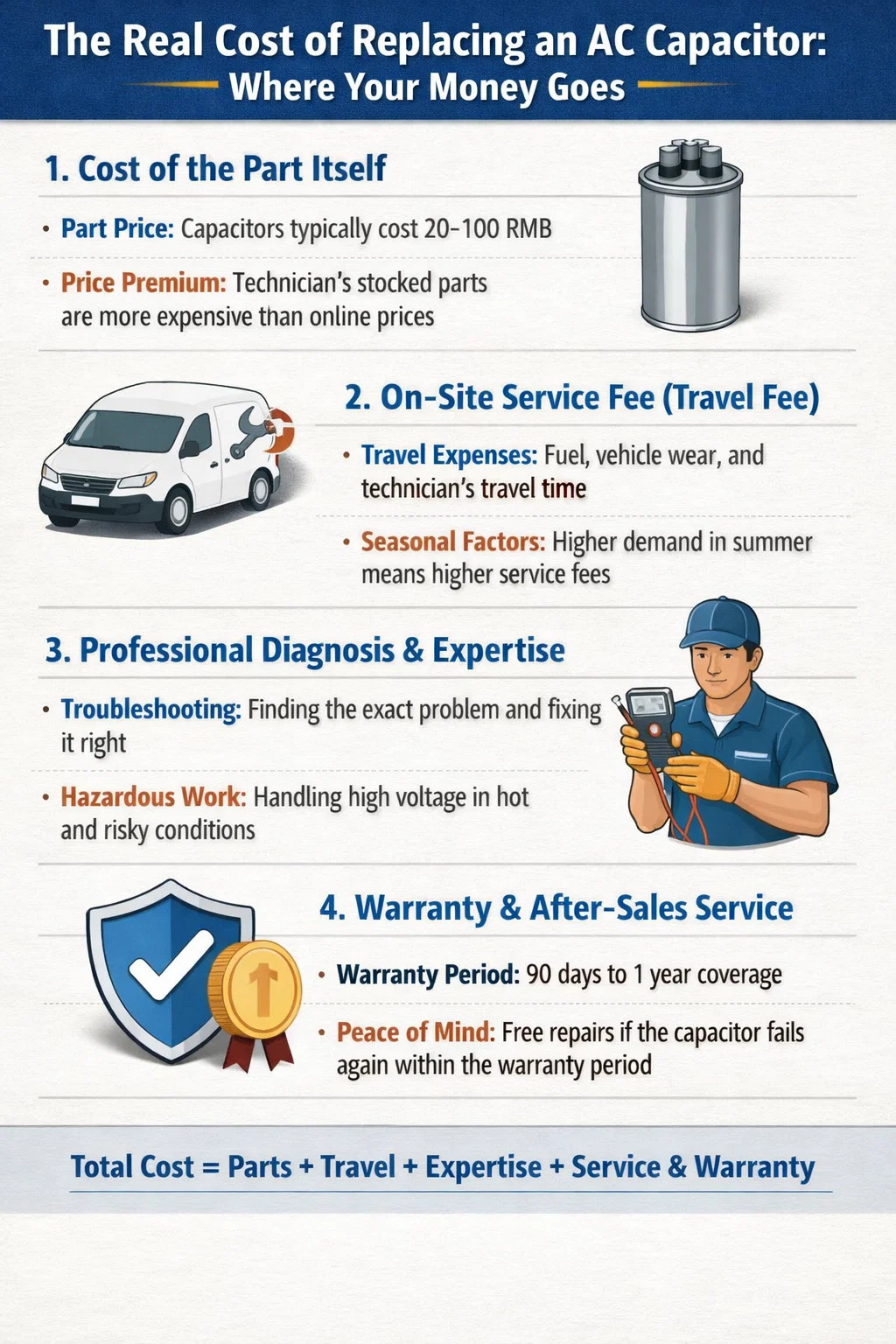 Periodo di garanzia: i condensatori CA sostituiti da aziende professionali di solito sono coperti da una garanzia per un certo periodo (ad esempio 90 giorni o un anno). Se il condensatore si guasta nuovamente durante questo periodo, di solito forniranno assistenza gratuita in loco. Il denaro extra che paghi è essenzialmente un'assicurazione per questa "tranquillità".