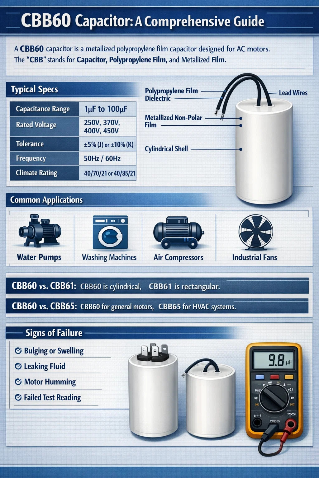 Sebbene entrambi siano condensatori in polipropilene, il CBB61 è tipicamente rettangolare e utilizzato per carichi più piccoli come i ventilatori da soffitto. Il CBB60 è cilindrico e gestisce le richieste di corrente più elevate di apparecchi più grandi come le pompe.