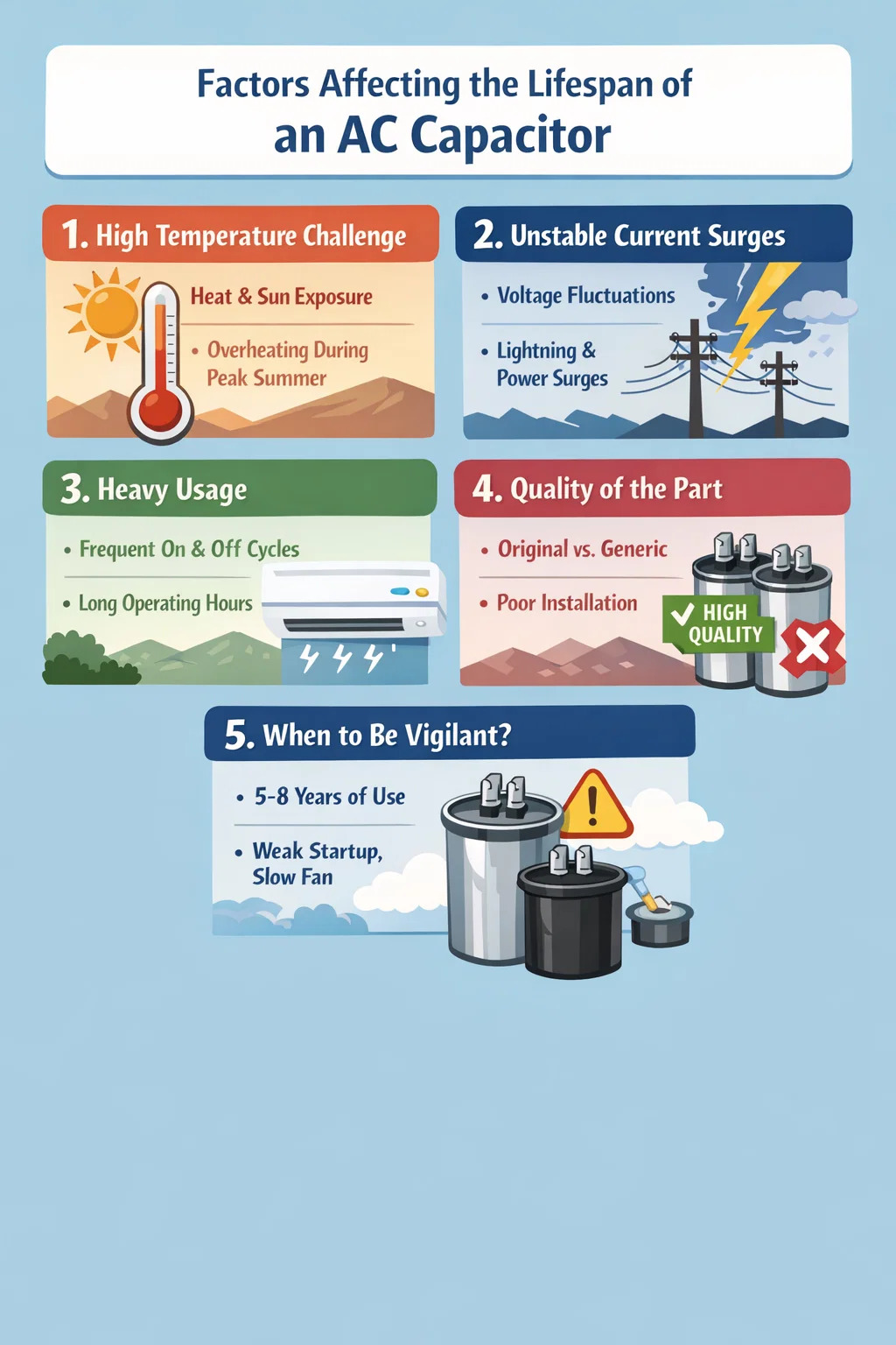 Fluttuazioni di tensione: se la tensione intorno alla tua casa è instabile e fluttua frequentemente, il condensatore CA deve caricarsi e scaricarsi ripetutamente per bilanciare la corrente. Questo frequente "lavoro stressante" accelera l'invecchiamento dei suoi materiali interni.