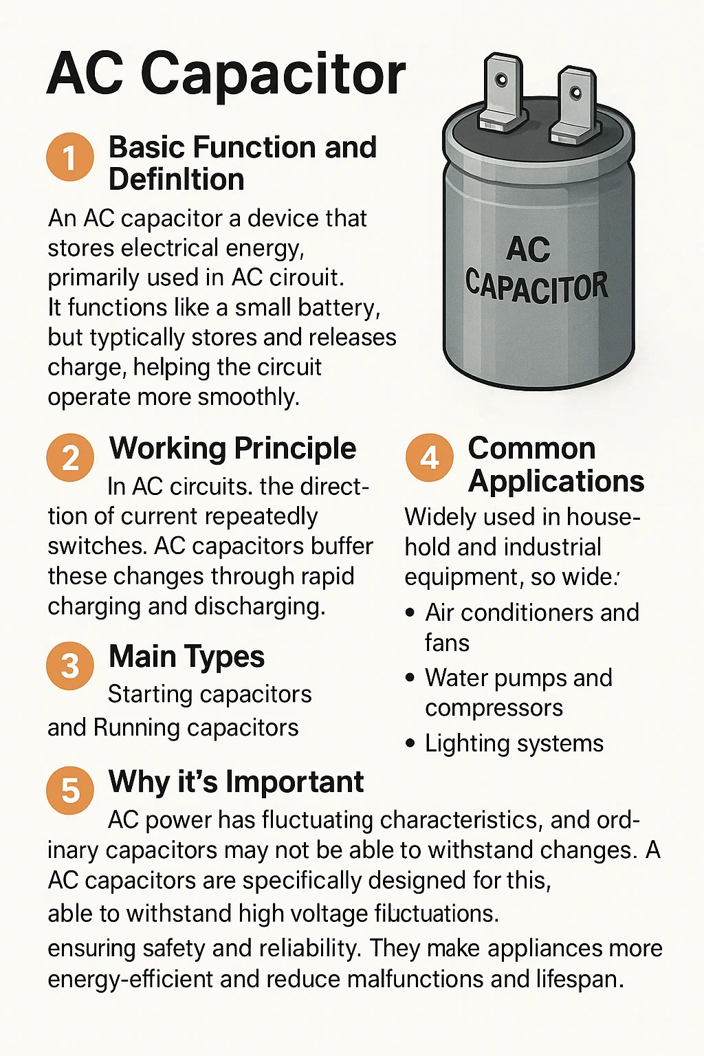 Un condensatore CA è un dispositivo che immagazzina energia elettrica, utilizzato principalmente nei circuiti CA. Funziona come una piccola batteria, ma funziona diversamente: non genera elettricità; invece, immagazzina e rilascia temporaneamente la carica, aiutando il circuito a funzionare più agevolmente. Mentre i condensatori ordinari possono essere utilizzati nei dispositivi CC, i condensatori CA sono progettati specificamente per le caratteristiche dell'alimentazione CA, poiché la direzione e l'entità della corrente CA cambiano costantemente.