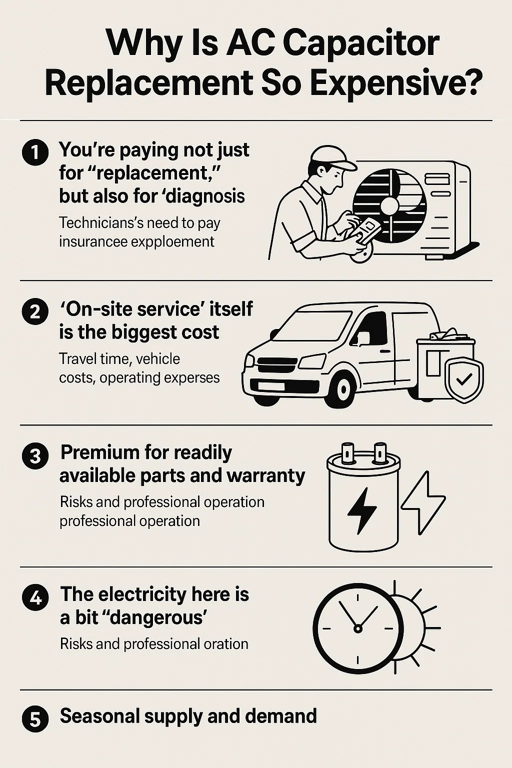 Molte persone a cui sono stati sostituiti i condensatori del condizionatore d'aria si sono probabilmente chiesti: Perché questa piccola parte cilindrica: il Condensatore CA – costa tanto poco quando lo cerco online, ma la bolletta è parecchie volte più alta quando arriva un tecnico a sostituirlo?